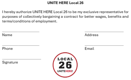 None of these statements are legally accurate. The bottom line on authorization cards is: If you are not sure if you want a union to represent you, do not sign a card. Whether you do or don’t sign a card, you can still vote - and you can vote YES or NO to UNITE HERE.